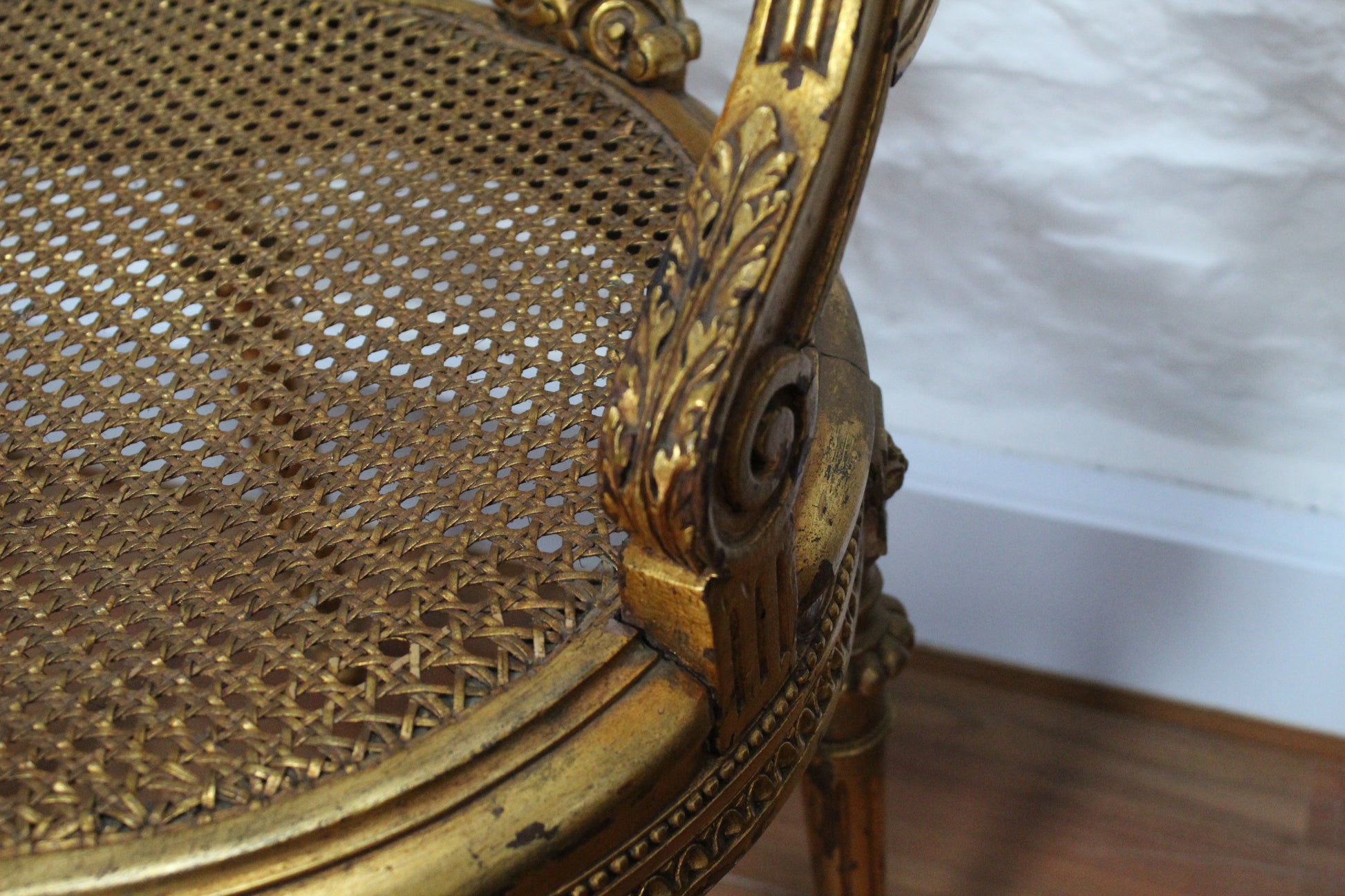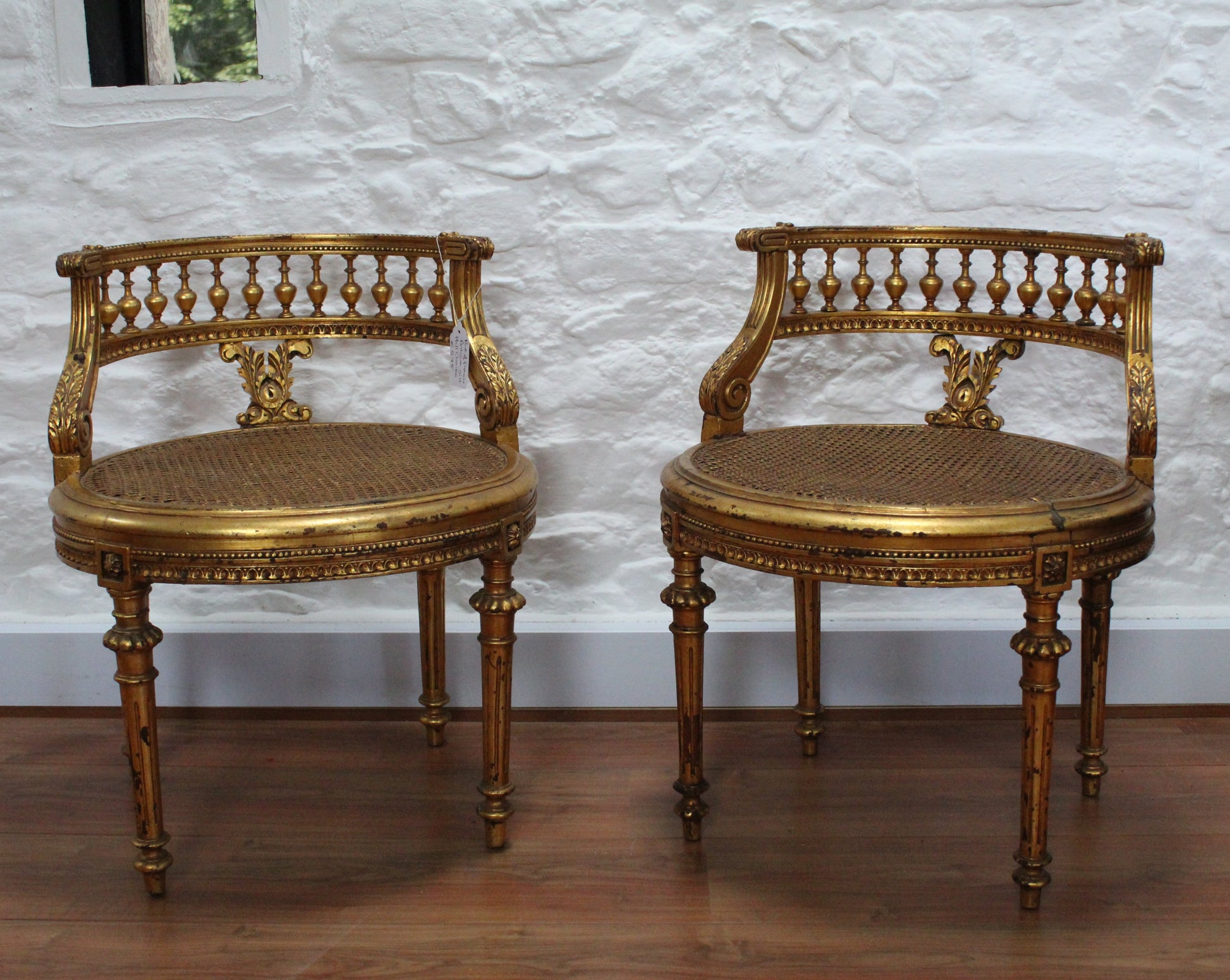 A pair of exquisite Louis XV1 style vanity chairs with caned seats and extravagant wraparound gallery backrests,they are a wonderful example of French intricate carvings.The gilt finish is beautifully aged giving these chairs fabulous character.